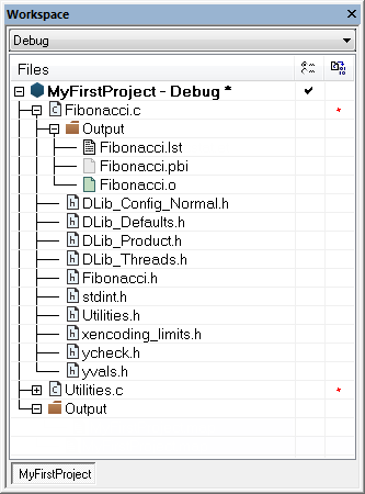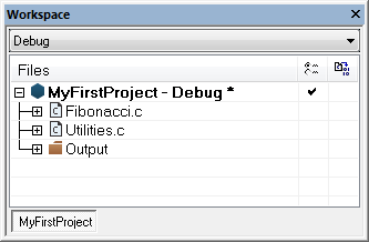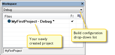 5 The project appears in the Workspace window:By default, two build configurations are created—Debug and Release—which you view from the drop-down list at the top of the window. In this tutorial, Debug is used.The asterisk next to the project name indicates that there are changes that have not been saved yet.