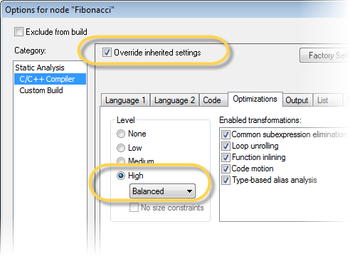 4 Select the Override inherited settings option, click the Optimizations tab and choose High level of optimization.Click OK.This new setting will only affect Utilities.c. Notice how overriding the project options on file level is indicated with a black checkmark (✓) in the Workspace window.