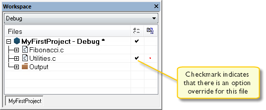 3 Click on the plus signs in the Workspace window to expand the view. As you can see, the IDE has also created an Output group that contains any generated output files. All included header files are displayed as well, showing the dependencies between the files:Now you will investigate how different optimization levels affect the generated code size. You will do this by changing the optimization level for just one of the files, Utilities.c, which means that you will override the project settings for that file.