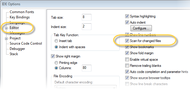 2 Choose Tools>Options to open the IDE Options dialog box and click Editor in the left-side pane. Make sure the option Scan for changed files is selected.Click OK.