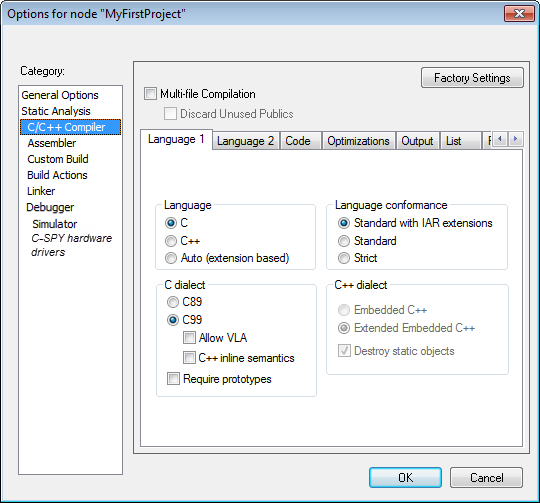 2 Choose Project>Add files to open a standard browse dialog box.Locate the files Fibonacci.c and Utilities.c and select them in the file selection list; click Open to add them to the MyFirstProject project.This tutorial only contains two source files. However, a real-life project probably contains many source files, maybe hundreds of files. To organize your files logically according to your project needs, you can organize them in hierarchies of groups. Organizing files in hierarchies of groups is useful for many reasons, you can:For more information about how to create advanced project structures, see the IDE Project Management and Building Guide.In the Workspace window, select MyFirstProject – Debug, right-click and choose Options from the context menu. The Target options page in the General Options category is displayed.