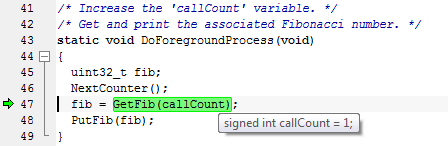 2 In Fibonacci.c, position your cursor in the fib = GetFib(callCount); statement and choose Debug>Run to Cursor (alternatively, click the button).