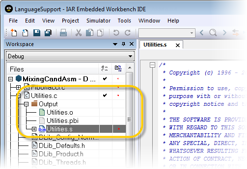 6 You can now find the file Utilities.s (or Utilities.sxx, depending on your product) in the Output folder. Open the file to examine the calling convention and to see how the C code is represented in assembler language.For more information about the calling convention used in the compiler, see the C/C++ Development Guide (or C/C++ Compiler User Guide, depending on your product).