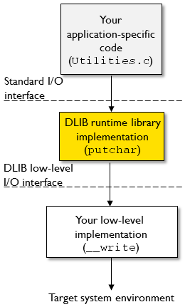 3 Before you can run your application on a stand-alone target system, you must typically adapt some parts of the runtime environment, for example the system initialization or if your application uses the DLIB low-level I/O interface.Utilities.c uses the standard I/O interface because it calls the library function putchar. The standard I/O interface is large and complex, and for this reason, the DLIB runtime environment is designed so that it performs all I/O operations through a small set of simple functions, which are referred to as the DLIB low-level I/O interface. In other words, the library function putchar calls the low-level function _ _write, which means that you do not have to modify putchar.